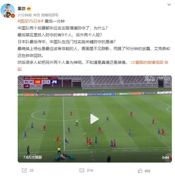 “最后一分钟,中国队两个后腰都失位去左路增援防守了,为什么?最后禁区里投入防守的有9个人,另外两个人呢?日本队最后传中,中国队在远门柱实施关键防守的是谁?最晚换上场也是最应该有体能的人,画面里不见踪影,而踢了90分钟的武磊、艾克森却还在拼命回防。然后很多人却把另外两个人奉为神明。不知道是真傻还是装傻。”