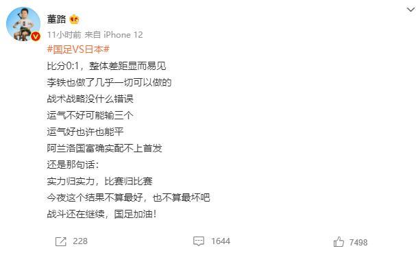 178直播9月08日讯 今天凌晨,国足在12强赛第二轮0-1输给日本,董路赛后在微博上表示,阿兰和洛国富确实配不上首发。