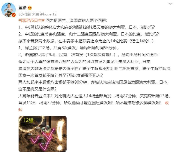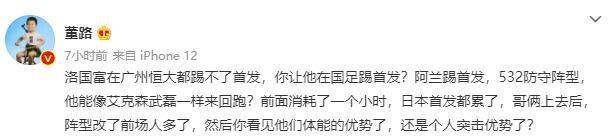 董路的这番话遭到了球迷质疑,对此他又发文表示:“洛国富在广州恒大都踢不了首发,你让他在国足踢首发?阿兰踢首发,532防守阵型,他能像艾克森武磊一样来回跑?前面消耗了一个小时,日本首发都累了,哥俩上去后,阵型改了前场人多了,然后你看见他们体能的优势了,还是个人突击优势了?”