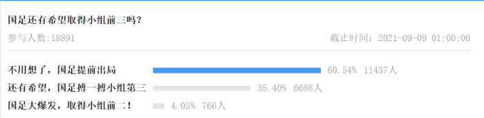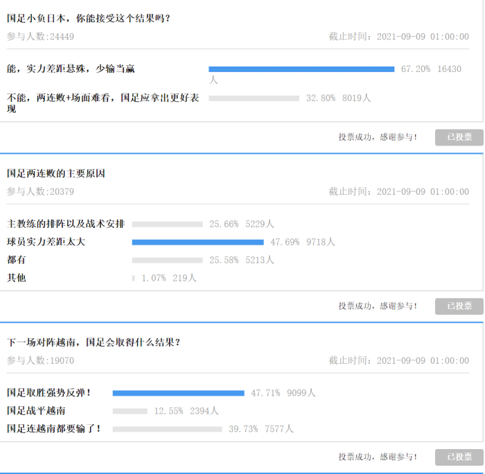 从结果能看出来大概有2万多人参与投票,针对4个问题的结果来看67.2%的球迷表示能接受这个结果,少输当赢!关于两连败的原因,有47.69%的人认为是双方球员实力差距大的原因!接下来面对越南,有47.7%的人认为国足能反弹击败对手终结连败。60.54%的人认为国足没机会进入世界杯,也不可能进入小组前三!