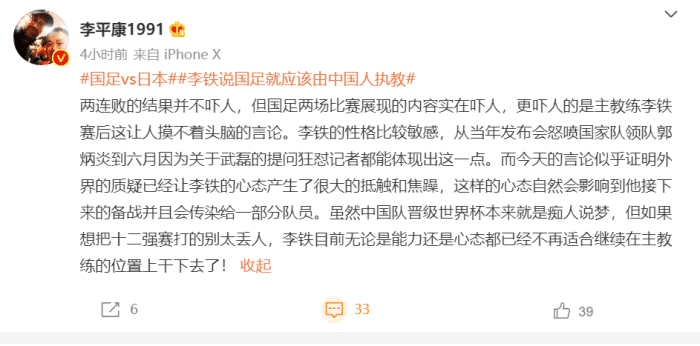 媒体人李平康更是发长文来反驳李铁,认为他的言论让人摸不着头脑,他的发声已经明显受到外界因素的干扰,并表示如果国足想把十二强赛打的别太丢人,李铁目前无论是能力还是心态都已经不再适合继续在主教练的位置上干下去了!