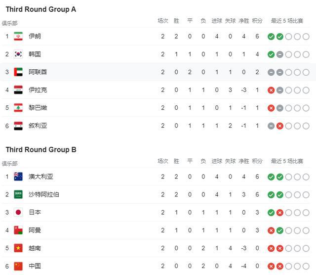 首轮国足0-3输给了澳大利亚,第二轮0-1输给日本,2战0进球丢4球积0分,因净胜球劣势排名B组倒数第一名,而越南则排名倒数第二,目前澳大利亚暂时排名小组第一。