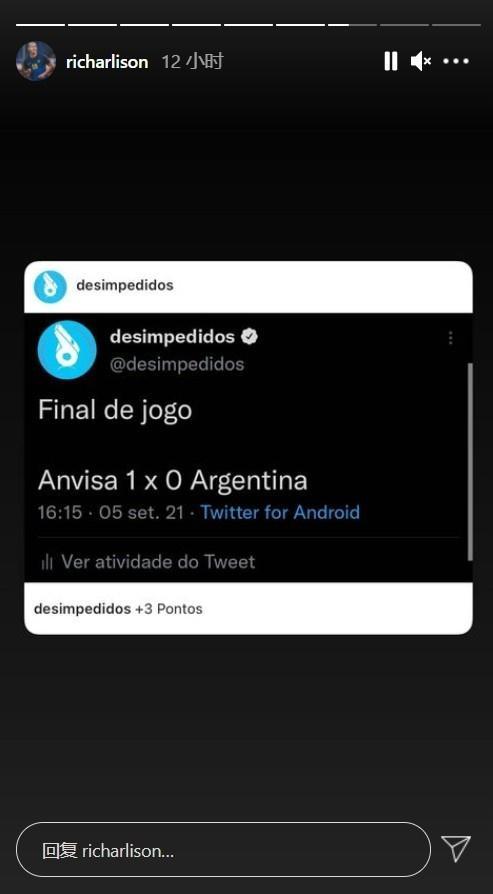 178直播9月07日讯消息,巴西阿根廷的比赛中断后,巴西球星理查利森转发推特“巴西卫生局1-0阿根廷”。