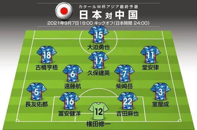 中场:远藤航、柴崎岳、久保建英、古桥亨梧、堂安律