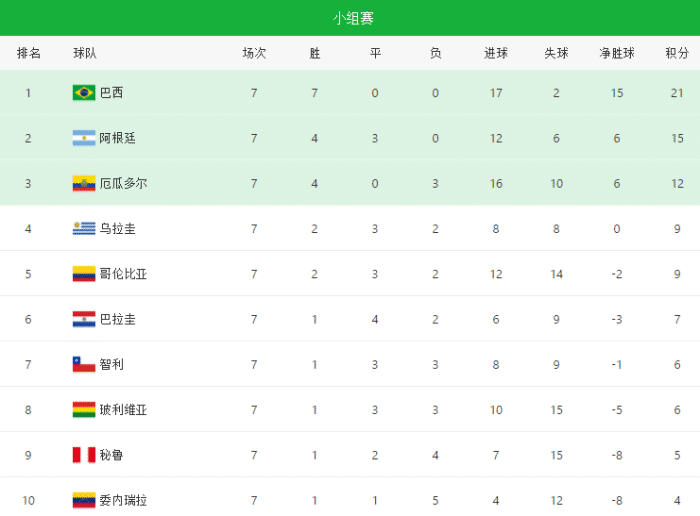 世预赛南美区结束之后前四名晋级到2022年卡塔尔世界杯,第五名将会与大洋洲的冠军争夺一张晋级世界杯的门票。接下来我们一起来看看世预赛南美区最新积分榜: