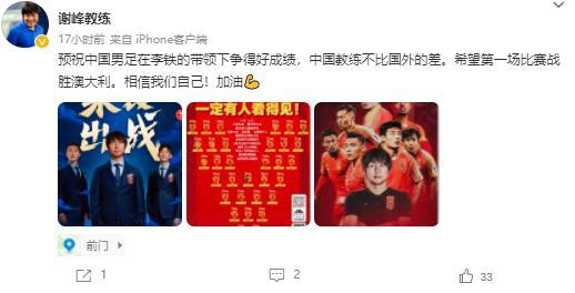 谢峰在微博上写道:“预祝中国男足在李铁的带领下争得好成绩,中国教练不比国外的差。希望第一场比赛战胜澳大利亚。相信我们自己!加油!”