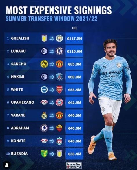 178直播9月02日讯 ,足球转会市场网盘点了今年夏窗的转会费前十,格拉利什成为了今夏的标王,英超独占前十中的七个席位。