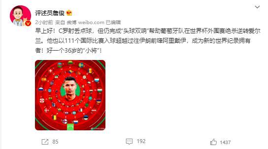 詹俊在微博写道:“早上好!C罗射丢点球,但仍完成“头球双响”帮助葡萄牙队在世界杯外围赛绝杀逆转爱尔兰。他也以111个国际比赛入球超越过往伊朗前锋阿里戴伊,成为新的世界纪录拥有者!好一个36岁的“小将”! ”