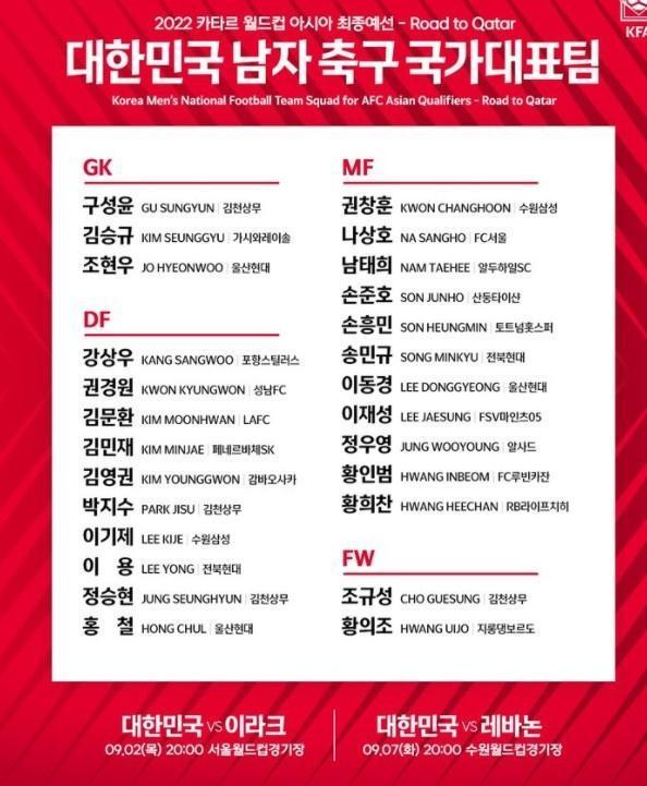 178直播讯 韩国国家队今日公布了9月份12强赛的大名单,由孙兴慜领衔。