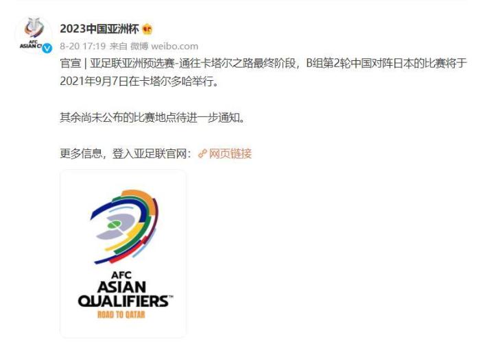 178直播讯 今日,亚足联官宣,B组第2轮中国对阵日本的比赛将于2021年9月7日在卡塔尔多哈举行。