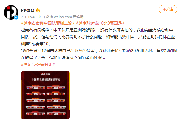 “越南对阵中国的结果无论是什么都说明不了问题。因为中国不是亚洲强队,他们只是亚洲二流。如果我们战胜中国,也只能证明我们排在亚洲第9或者第10位,并不能解决问题。我们要通过12强赛认清自己在亚洲的位置,以便冲击扩军后的2026世界杯。虽然我们现在取得了进步,但和顶级强队之间的差距还很大。”