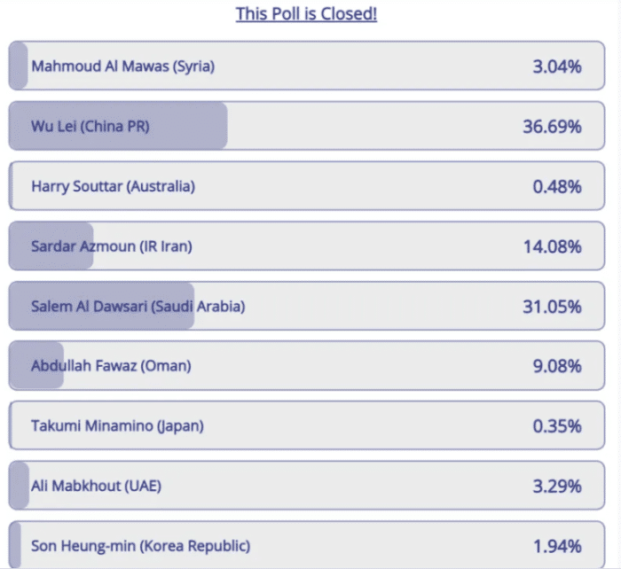 目前投票已经关闭。武磊以36.69%的得票率位居第一,力压第二的沙特球星阿尔道萨里,两人遥遥领先第三名、伊朗球星阿兹蒙(14.08%)。