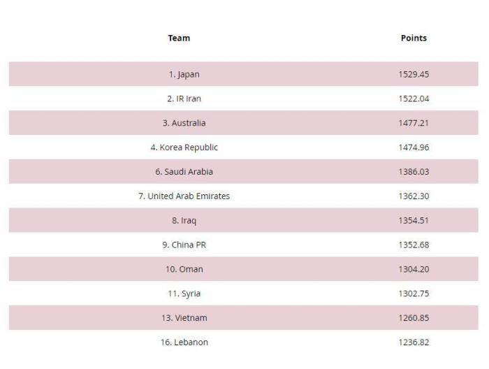 亚洲球队排名如下: