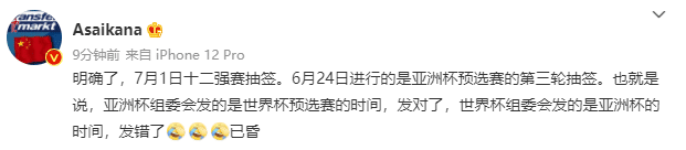 178直播讯朱艺在微博上写道:“明确了,7月1日十二强赛抽签。6月24日进行的是亚洲杯预选赛的第三轮抽签。也就是说,亚洲杯组委会发的是世界杯预选赛的时间,发对了,世界杯组委会发的是亚洲杯的时间,发错了,已昏。 ”