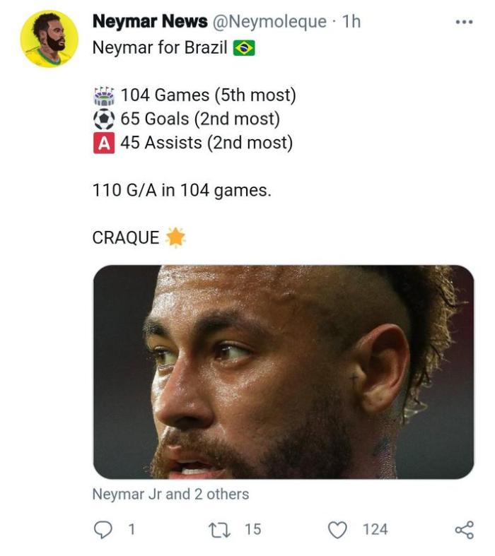 目前内马尔已代表桑巴军团出场104次(队史第5),打入65球助攻45次,共造110球,其中进球数和助攻数都是队史第二多。