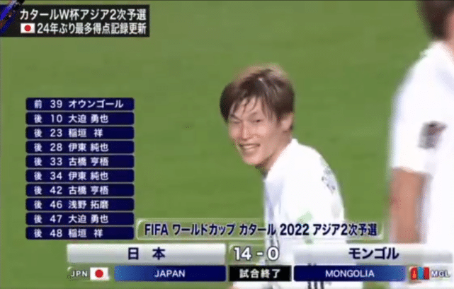 然而,中国球迷并不买账,因为日本男足在几个小时之后就用“14球大胜”刷新了大家的认识。在世预赛亚洲区40强赛F组的一场比赛中,日本男足迎来蒙古男足的挑战。凭借大迫勇也“帽子戏法”、稻垣祥和古桥亨梧“梅开二度”,以及、镰田大地、守田英正、伊东纯也、浅野拓磨联袂的进球,再加上蒙古球员的“自摆乌龙”。最终,日本男足以14比0击败了蒙古男足。值得一提的就是,日本男足这一次攻入的14球,是1967年15比0击败菲律宾之后最大的比分。如今,日本男足在小组当中获得“五连胜”,积15分攻入27球排名F组的头名,基本锁定晋级“12强赛”的名额。