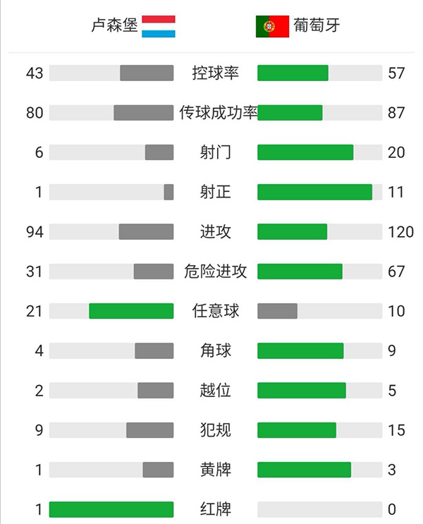 全场比赛结束,葡萄牙3-1逆转卢森堡。