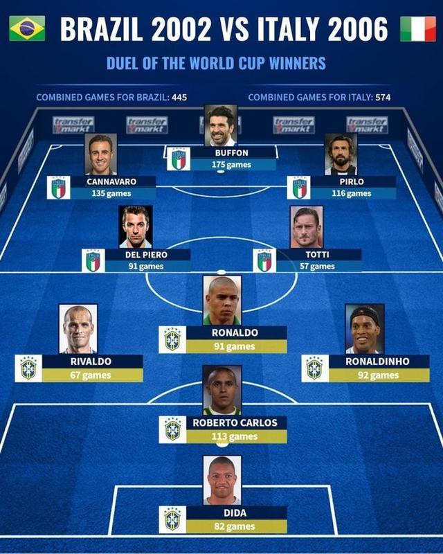 178直播2月28日讯 德转今日发布了2002世界杯冠军巴西与2006世界杯冠军意大利的一套五人制阵容对决,并写道:谁能胜出?