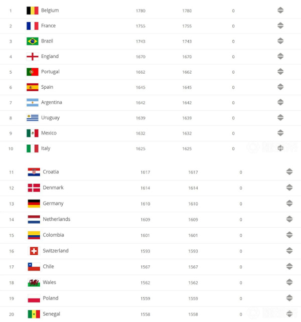 FIFA最新一期世界排名:比利时位列榜首,国足仍居第75位
