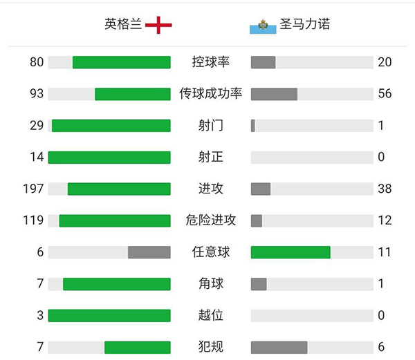 第14分钟,英格兰取得领先,芒特中路直塞给左路的奇尔维尔,后者横扫门前,沃德-普劳斯包抄推射远角入网,英格兰1-0圣马力诺。