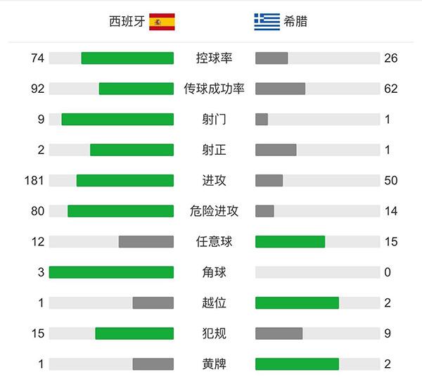 178直播讯:北京时间3月26日3:45,2022年世界杯欧洲区预选赛B组第1轮,西班牙主场迎战希腊。上半场,奥尔莫头球攻门顶高,科克射门被封堵,奥尔莫远射中框,科克助攻莫拉塔破门。下半场,伊尼戈-马丁内斯送点,巴卡西塔斯点射扳平,最终,西班牙1-1希腊。
