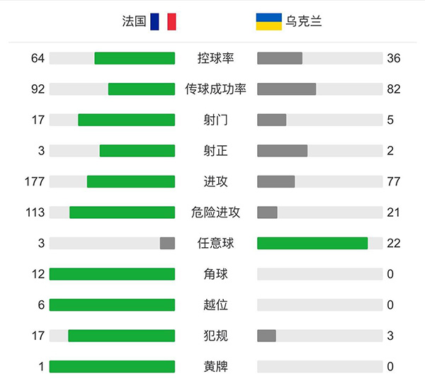 全场比赛结束,法国1-1乌克兰。