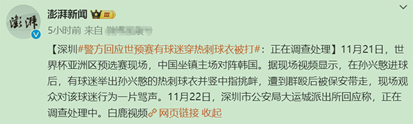众所皆知,当天比赛,韩国男足的第一个点球完全是卡塔尔主裁判的偏袒,这个点球本来就不该给,卡塔尔裁判的吹罚让全场球迷狂骂,而随后,孙兴慜命中了点球后,特意跑到了中国男足球迷的区域做出了闭嘴的手势,这也让中国男足的球迷情绪本来就激动,而在这个时候,眼镜球迷高调的亮出了孙兴慜的球衣,并且进行了展示,然后穿在身上,男子的举动也是引发了主队区域球迷的不满,可是面对质疑声,眼镜球迷不断的谩骂身边的人,并在做出了比中指的手势。