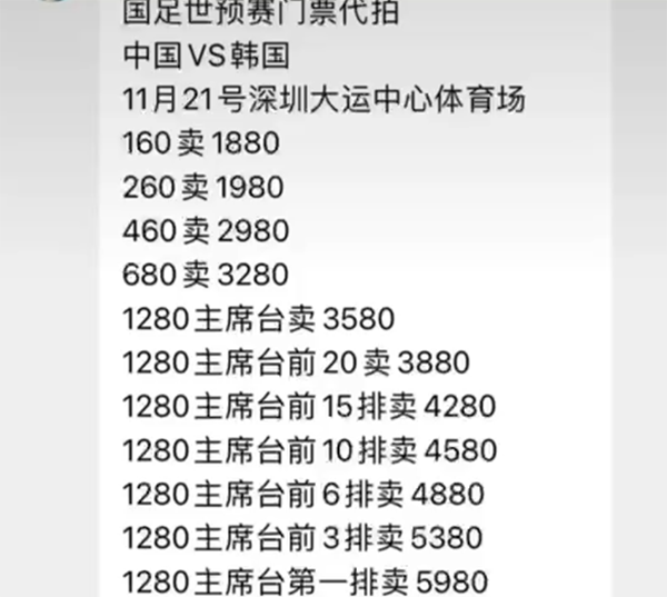 国足的球票早早售罄,官方信息显示,这场比赛是强实名,也就是买了票之后不允许倒卖给其他人,必须是自己的证件进入到球场。但依旧有很多的黄牛在变相操作,采取代拍和保证的方式,有名嘴在社交媒体上晒出了一些黄牛给出的价格,国足VS韩国队的球票价格暴涨,其中最低档160元每张的球票,居然飙升到1880元,翻了足足超过10倍。