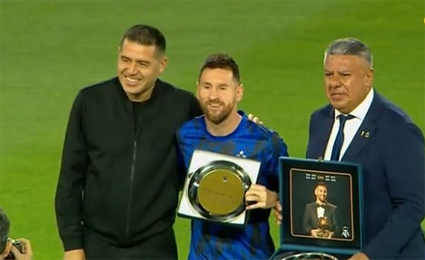 赛前阿根廷足协向梅西颁发金球奖纪念盘,致敬梅西史无前例的第八个金球奖,里克尔梅、阿根廷足协主席塔皮亚给梅西颁奖。