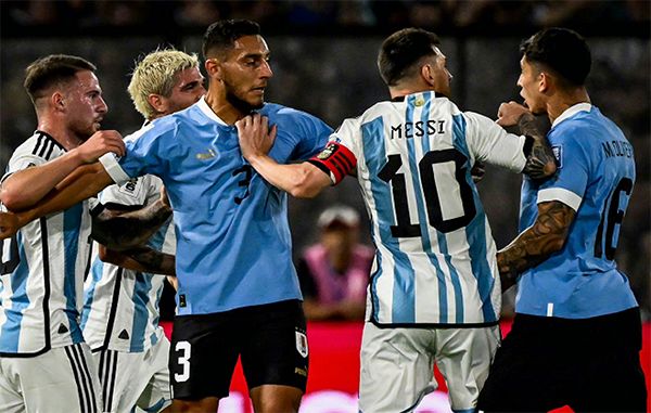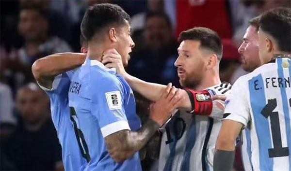 上半场双方的身体对抗很强,两队球员火药味十足,第20分钟,马克西米利亚诺和阿根廷球员起冲突,梅西和德保罗也上前,梅西上前加入推开对手,锁喉奥利维拉脖,这次的冲突,裁判并非出牌。