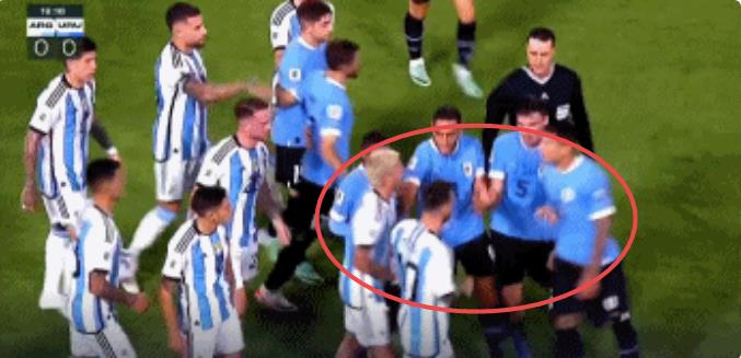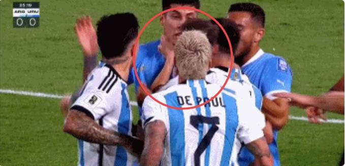 不过,在这一场比赛会中,这样的角色似乎对调了。比赛进行到第19分钟,阿根廷进攻到对手进去,阿尔瓦雷斯被撞倒后裁判没有吹罚也让场上的氛围开始激化,在随后的防守中,德保罗放倒了马克西米利亚诺-阿劳霍,随后三个人纠缠在一起,两队的队员也是迅速冲上前。当奥利维拉对着德保罗大骂的时候,梅西冲过来推开了奥利维亚并且有一个锁喉对手的举动,在裁判将双方分开的时候,梅西还在继续怒喷奥利维拉。