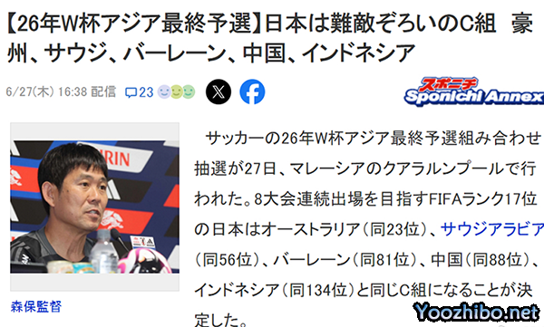 日本媒体《每日体育》的标题是,日本是集齐难敌的C组:澳大利亚、沙特、巴林、中国、印度尼西亚。冈崎慎司将日本抽进了死亡之组。日本媒体评论说,这已经是连续8届世界杯和沙特同组,也是连续3届世界杯和澳大利亚同组,显然这不是一个很快就能决出出线名额的小组。