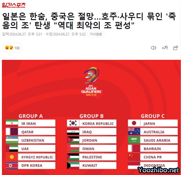 韩国媒体热议国足的抽签结果,《DALIY SPORTS》 的评价是:日本叹息,中国绝望。澳大利亚-沙特“死亡之组”成为“有史以来最糟糕的小组”,这个小组集中了6个档次球队中的4支本档次领头羊。韩国媒体还谈到了中国队的魔鬼赛程,开局连续面对强敌,同时引用中国媒体的观点:“历史上最糟糕的世界杯预选赛小组”。