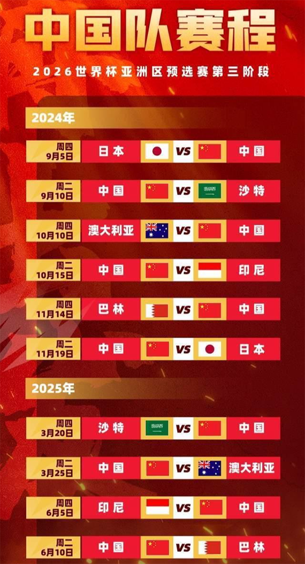 本次18强赛,第5档的中国男足与日本、澳大利亚、沙特、巴林和印尼同分在C组。小组前2名直接获得世界杯参赛资格。而小组第3和第4名,将获得下一阶段附加赛的参赛资格。按照赛程,中国男足将先在9月5日18点35分,做客挑战亚洲第1的日本男足,随后在9月10日回到主场大连在梭鱼湾球场,迎战沙特男足。