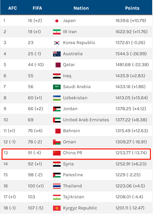 国足亚洲第13名的位置都已经岌岌可危,因为身后的叙利亚和巴勒斯坦、甚至泰国与国足的分差已经相当小了。叙利亚尽管没晋级18强赛,但9月份两场热身赛他们分别2-0击败毛里求斯3-0击败印度,FIFA积分增加了6.23分,距离国足不到1分的差距。