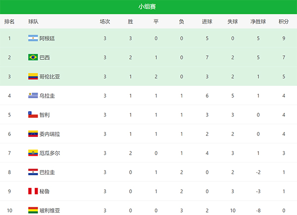 178直播10月13日世预赛南美区第三轮结束争夺,阿根廷队1-0击败巴拉圭,豪取3连胜,升至第一。巴西队本轮1-1战平委内瑞拉。本轮另外三场比赛,智利2-0秘鲁、哥伦比亚2-2乌拉圭、厄瓜多尔2-1玻利维亚。接下来我们一起来看看世预赛南美区最新排名: