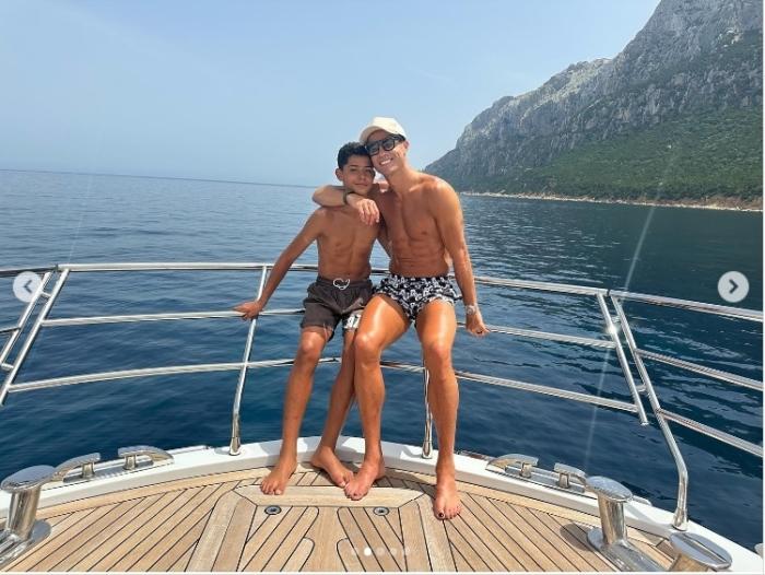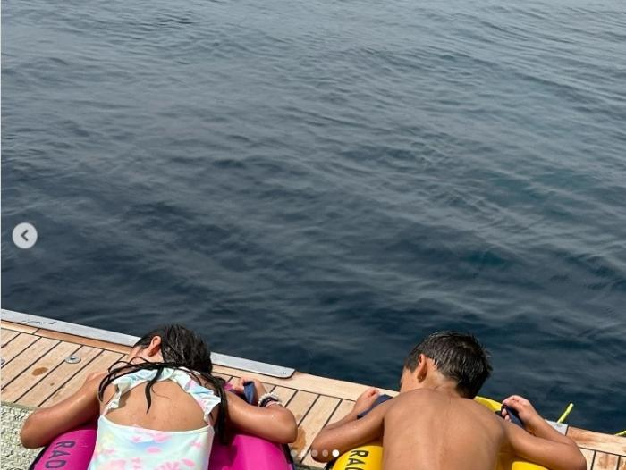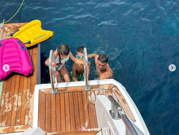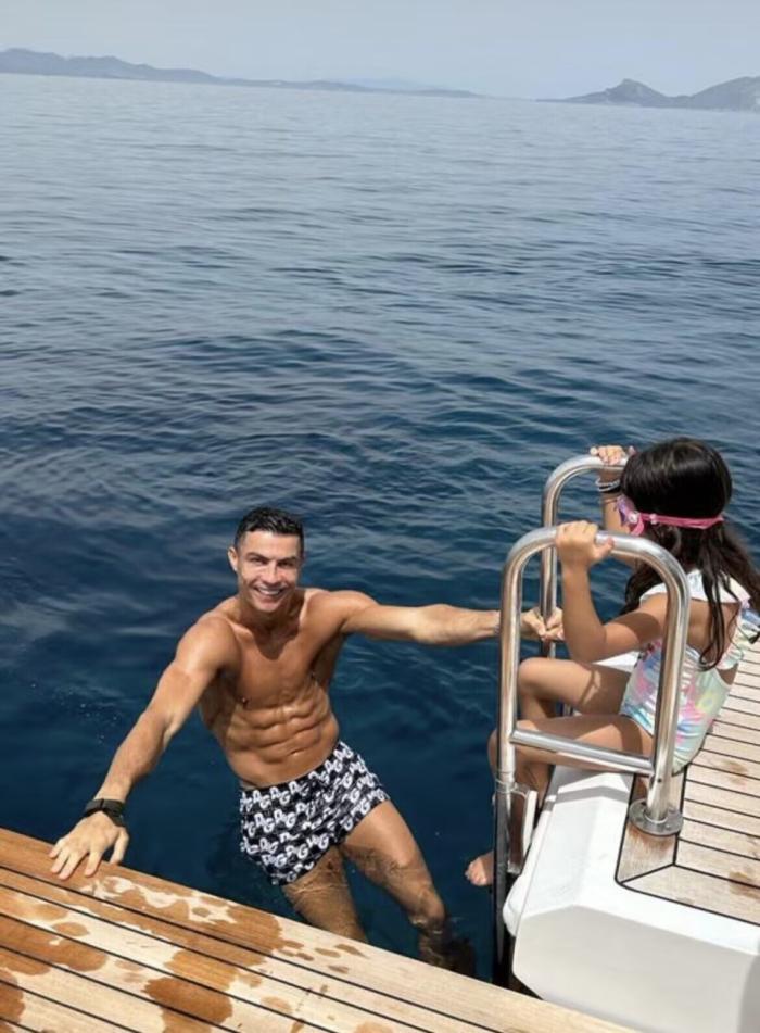 C罗还带着孩子玩起潜水并且享受日光浴,展现了自己慈父的一面。玩到兴起时,C罗更是在游艇上秀起了“跳水”绝技。C罗翻身入水的敏捷动作,可谓相当专业,不输专业的跳水运动员。