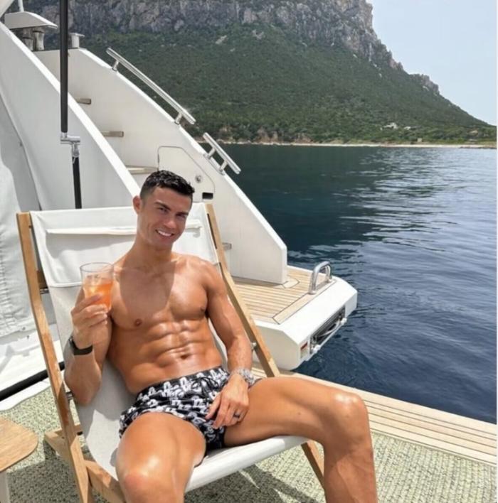而C罗则戴着墨镜和鸭舌帽,帅气十足。赤膊的他再次展现了自己8块立体腹肌。尽管已经38岁,但C罗的身材完全没有走形,依旧如雕塑般有型。