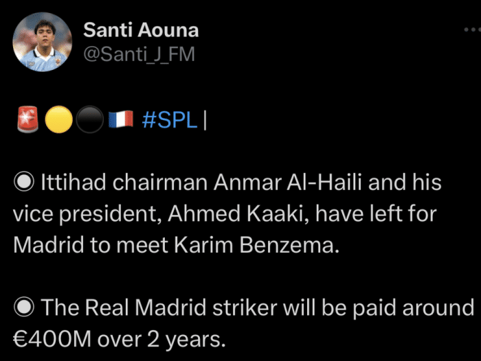 北京时间6月4日晚,来自法国知名媒体Foot Mercato首席记者Santi Aouna的独家报道,沙特联赛冠军吉达联合,已经为本泽马提供了一份2年价值4亿欧元的合同。