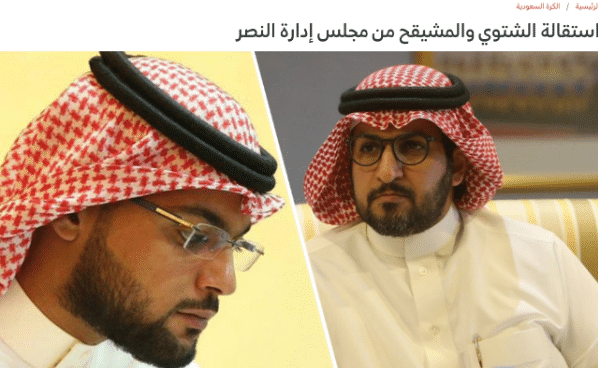 除了主帅之外,在1-1战平赛哈特海湾,沙特媒体“arriyadiyah”报道称利雅得胜利俱乐部董事会成员Muhammad Al-Shetawi和Turki Al-Mashaqih宣布辞职,其中一人在社交媒体上确认,称:“因为我的过错致使球队陷入困境。”