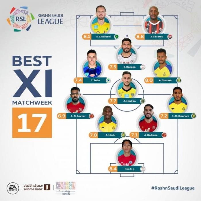 中场:阿尔瓦罗-梅德兰(布赖代合作)、克里斯蒂安-泰洛(哈萨征服)、阿卜杜勒-加里布(利雅得胜利)、伊维尔-巴内加(利雅得青年)