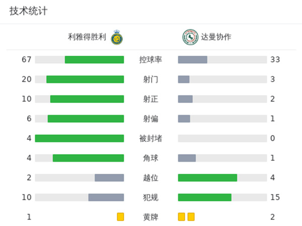 第71分钟,利雅得胜利获得点球!马内左路下底传球打在防守球员手上裁判判罚点球,随后C罗主罚点球破门,利雅得胜利3-0达曼协作。