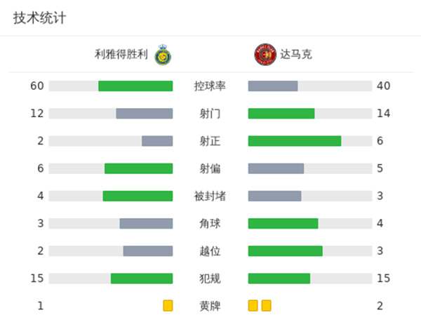关键事件: 第45+2分钟,达马克后场长传,恩昆杜插上单刀突入禁区冷静低射破门!利雅得胜利0-1达马克↓
