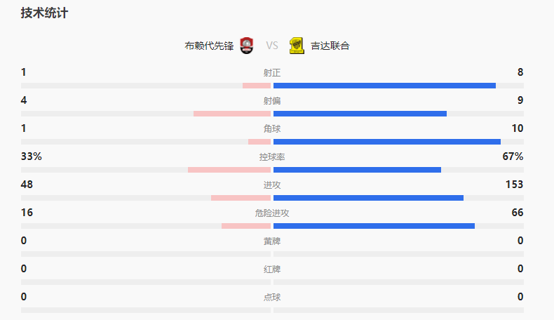 全场比赛结束,吉达联合3-0布赖代先锋。