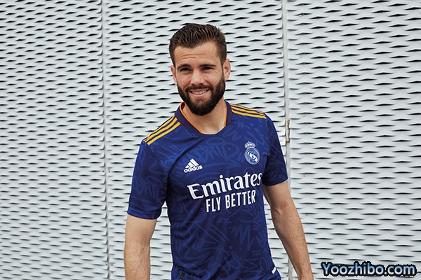 2021-22赛季皇家马德里客场球衣以象征胜利的蓝色为基色,同时点缀有幸运橙和白色细节,代表了西班牙首都富有生机的文化。球衣的领后还有一个特别的艺术风格的皇家马德里图标。