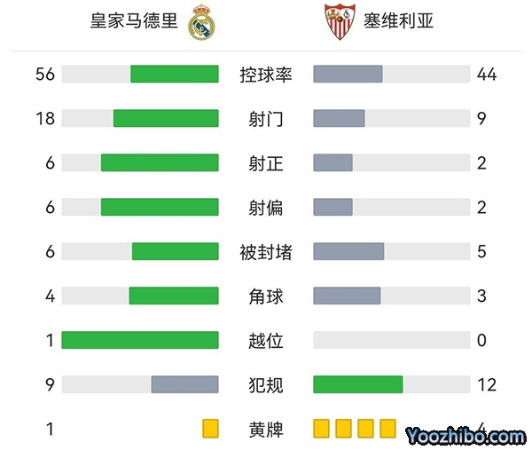 全场结束,皇家马德里主场3-1战胜塞维利亚。