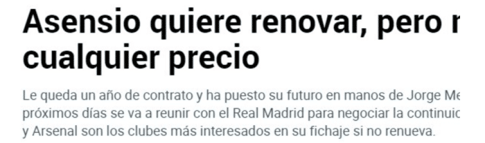 阿森西奥的合同将在明夏到期,他的经纪人会在未来几天与俱乐部会面,谈续约问题。