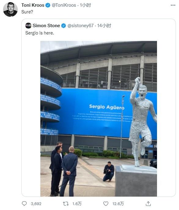 178直播05月14日讯 消息,有网友称曼城的阿圭罗雕像神似皇马球星克罗斯,克罗斯在推特上做了回应。