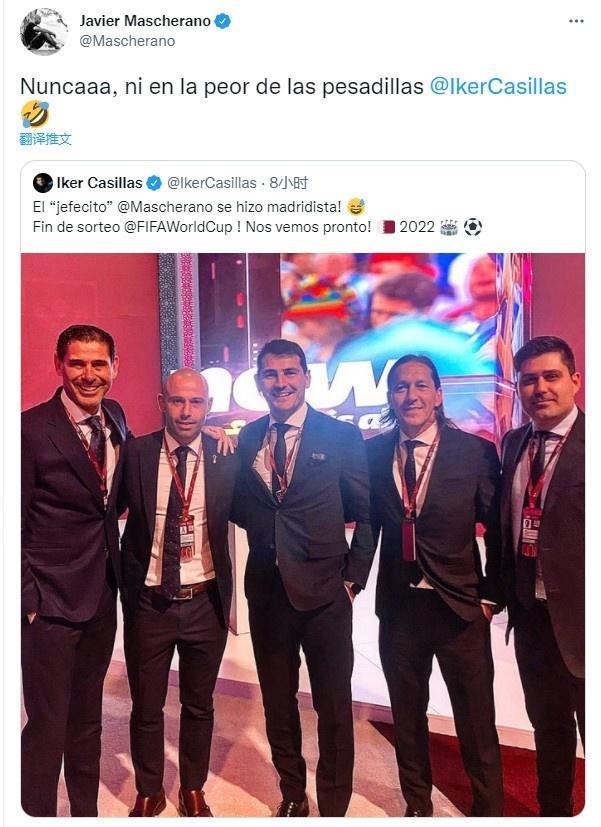 178直播04月03日讯 消息,卡西利亚斯晒照调侃马斯切拉诺是马德里人,小马哥回复“在噩梦里也不可能”。