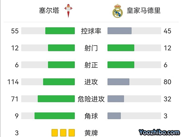 全场比赛结束,最终皇马客场2-1塞尔塔。